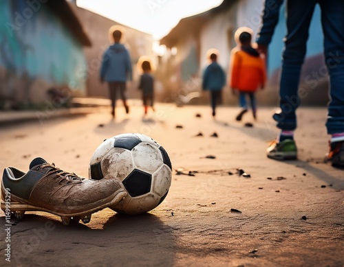 Generated image Broken and mud-stained shoe next to a soccer ball with poor children playing in the street