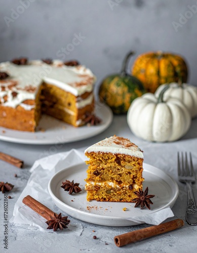 Generated image. Pumpkin spice cake with white frosting. autumn vibes. Organic
