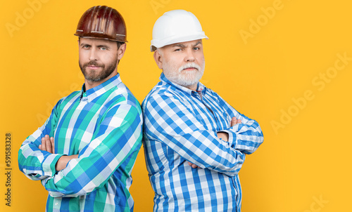 generation, man, men at work, working man, occupation, builder, repairman, handyman, labor, labour day, labor, labourer, engineer, guy, isolated, yellow background, studio, contractor, foreman, labourer, background, helmet, copy space, portrait, banner, face, advertisement