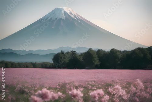 fuji, landscape, flower garden, nature, flower, sky, fuji, spring, blue skies, world heritage, mountain, japan, full bloom, sunny, pink, pink, tourist attraction, plant, copy space, view, showplace, illustration, tour tourism, fuji, mount, travel, lovely, volcano, volcanic, ai