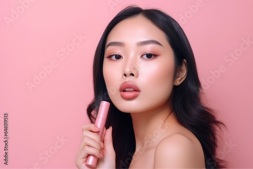 Generative ai, Beautiful young woman applying cosmetic cream treatment on her face isolated on background . Girl with clean fresh skin