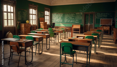 Generative AI Classroom with empty wooden desks and with green board , in scool