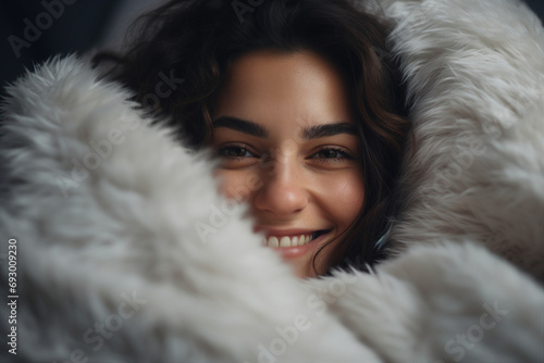 Generative AI close up picture of happy young person wrapped in warm laundry blanket