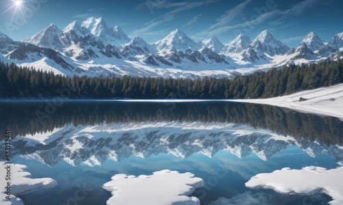 mountain, cloud, forest, lake, water, fir, tree, sun, peak, landscape, nature, alps, snow, travel, view, blue, hill, ice, sky, winter, high, glacier, rock, white, alpine, cold, eruption, illustration
