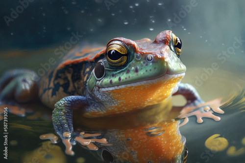 Generative AI illustration of closeup of colorful frog siting in reflective water of pond over dark blue background with transparent bubbles