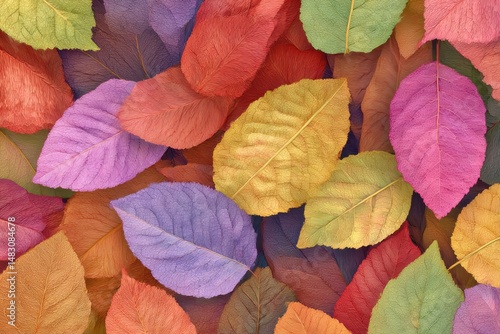 Generative AI illustration of full frame background consisting of pile of multicolored autumn leaves placed one on another
