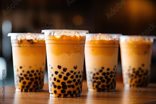 Generative AI illustration of plastic cups of boba milk tea, with bubbles, close-up shot, depth of field, gourmet dessert, blurry background