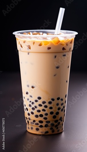 Generative AI illustration of product photo plastic cup of boba milk tea, with bubbles, fun, pastel background