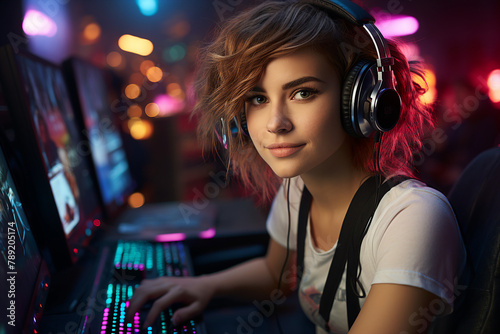 ai, art, artificial, design, effect, generative, graphic, illustration, intelligence, modern, picture, technology, visual, 104, gamer, play, player, video, video game, cyber, cyberspace, entertainment, fantasy, future, futuristic, gaming, illusion, cyberspace, online, projection, reality, simulation, space, surreal, tech, virtual, vision, equipment, headset, earphones, earphones, innovation, computer, female, woman, young, neon, light
