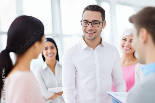office, celebration, employee, laughing, conversing, decor, party, festive, happy, colleague, joyous, workplace, gathering, interaction, cheerful, social, event, professional, co-worker, smile, joy, casual attire, team, camaraderie, bonding, socialising, laughter, dialogue, diversity, inclusive, enjoyment, fun, balloon, pennant, indoor, generative, ai