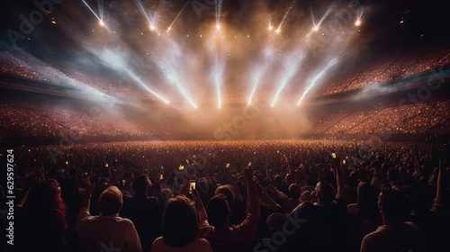 Generative AI, People crowd on music rock festival concert in stadium, big stage lit by spotlights..