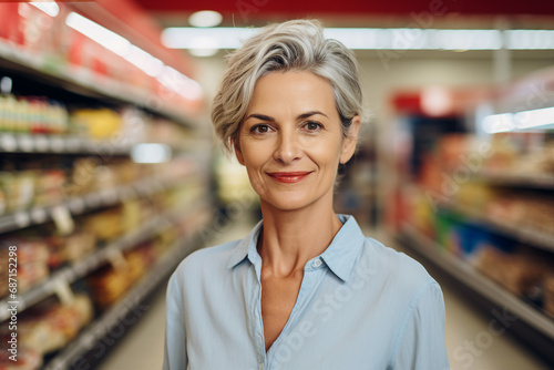 Generative AI picture of adorable woman choose products in a grocery store supermarket