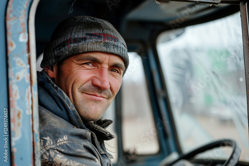 truck, driver, man, person, work, men at work, job, vehicle, transportation, professional, logistic, delivery, road, travel, trucking, industry, cabin, truck driver, portrait, winter, uniform, freight, roadwork, occupation, automotive, steering, hauling, career, smiling, male, highway, generative, ai, 102