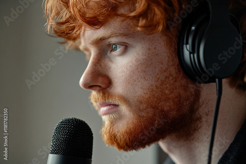 Generative AI portrait of a vibrant podcast host with mic headphones during live radio show