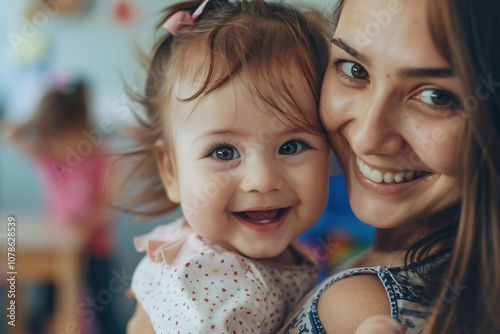 mother, baby, smile, hug, portrait, children, childcare center, caregiver, bonding, happy, love, affection, eltern, family, nanny, babysitter, joy, motherhood, caring, parenthood, toddler, infant, warmth, comfort, human relationships, happiness, closeness, emotion, indoor, childhood, security, young, togetherness, innocence, adorable, tenderness, hugs, supportive, connection, babysitting, friendship, trust, playful, home, day care, nurturing, generative, ai