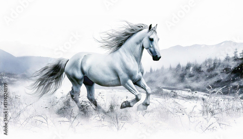 white horse, horse, horse, horse, animal, mammal, run, wild, winter, snow, snow, white, lovely, beauty, nature, movement, sprint, copy space, background, material, new year, new year's day, new year, picture, illustration