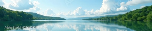 Gentle breeze blowing across a peaceful lake with puffy clouds, calmness, reflection