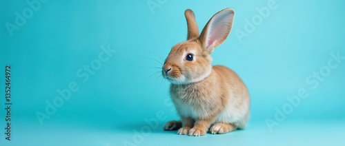 Gentle brown rabbit with big ears and soft fur sitting on a vivid light blue surface.