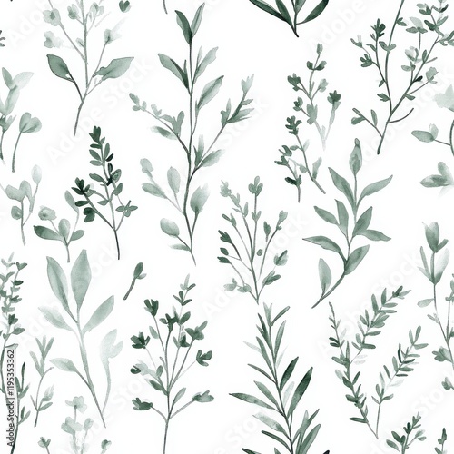 Gentle doodle cartoon drawings in watercolor style featuring various delicate green plants and herbs on a white background