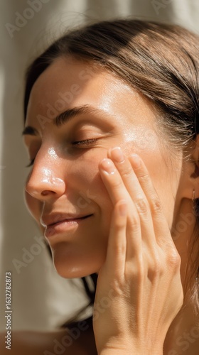 skincare, serum, facial, massage, beauty, relaxation, calm, woman, natural, light, glowing, skin, texture, elegant, hand, smiling, enjoyment, wellness, smooth, soft, application, routine, radiant, aesthetic, serene, gentle, touch, calming, life events, healthy, rejuvenation, treatment, mindfulness, aglow, ritual, sunlight, bliss, calmness, refresh, nourishment, intimacy, pampering