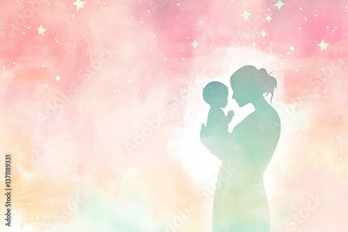 mother, baby, motherhood, infant, newborn, silhouette, watercolor, pastel, colours, soft, gentle, tender, loving, care, family, bond, connection, star, sky, dreamy, peaceful, serenity, calm, happiness, hope, future, dream, delicate, artistic, illustration, artwork, graphic, design, background, texture, card, invitation, print, childcare center, bedchamber, home decor