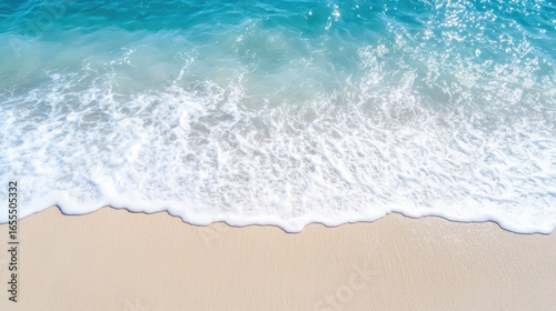 Gentle sea foam caresses sandy shore under bright sunlight, creating serene atmosphere