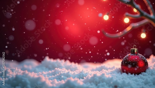 Gentle snowfall softly lit against deep crimson Christmas background, warm light, warm, festive background
