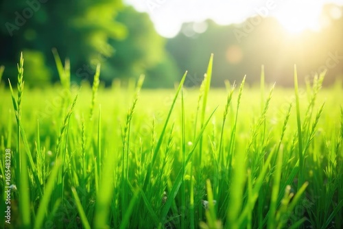 Gentle summer breeze ruffling the tall grass in a sun-drenched meadow, creating waves of green Perfect for nature, weather, and serenity themes , freshness, climate, calm