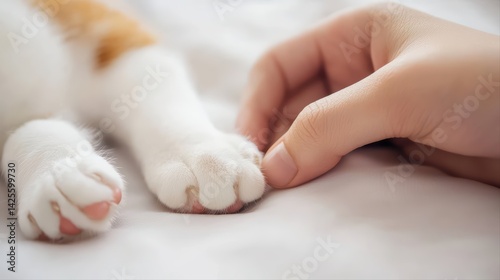 Gentle Touch Between Human Hand and Cat Paw on Soft Surface