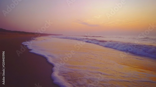 Gentle waves caress a tranquil beach, basked in warm twilight hues, creating a dreamy, peaceful beachfront moment during a sunset’s gentle embrace.