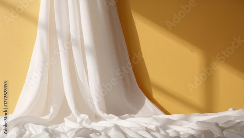 Gentle White Cloth Gracefully Hanging on a Cozy Yellow Background with Natural Illumination
