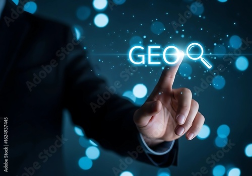 GEO Search Technology: Hand Points to Glowing Location Icon