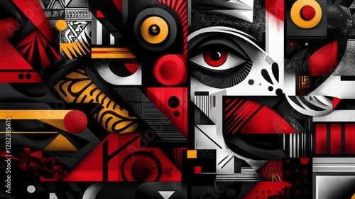 abstract, geometric, collage, eye, red, black, white, yellow, shape, pattern, modern, art, design, digital, illustration, contemporary, artistic, composition, graphic, visual, line, circle, square, triangle, texture, contrast, decorative, bold, stylised, creative, expressive, complex, dynamic, vibrant, symmetric, asymmetrical, monochrome, polychrome, ornamental, angular, curvilinear, rhythmic, structure, form