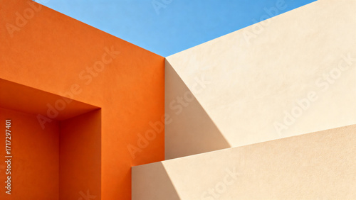 Geometric architectural forms with orange and beige walls under a clear blue sky