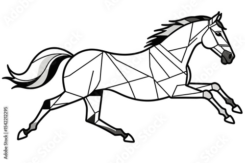 horse, geometric, running, animal, illustration, graphic, design, modern, art, minimalist, line, black, white, fast horse, mustang, mane, tail, cartoon, drawing, outline, equine, racehorse, wild, strength, speed, motion, abstract, polygon, triangle, elegant, pattern, vector, icon, symbol, mascot