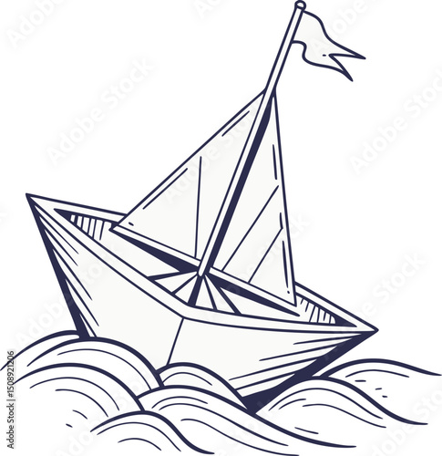 Geometric Line Art of Sailing Ship on Ocean Waves in Minimalist Monochrome Style