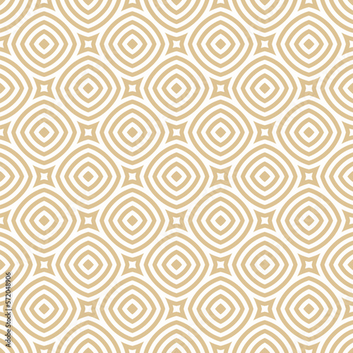 Geometric line seamless pattern. Luxury golden vector abstract texture with curved shapes, circles, squares, stripes, repeat tiles. Gold and white minimal geometric ornament. Simple elegant background