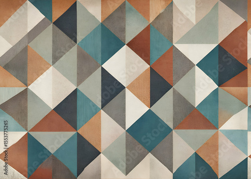 Geometric pattern of overlapping triangles in muted tones of earth and teal colors. Abstract design with a textured. three-dimensional appearance. suitable for a modern interior setting.
