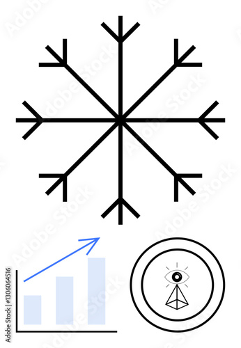 Geometric snowflake, growth bar chart with upward arrow, and abstract eye in circular frame. Ideal for progress, insight, strategy, vision, environment innovation balance concepts. Flat simple