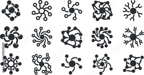 Geometric vector icon set featuring abstract molecules and network symbols for science and technology projects