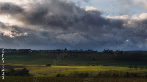 German landscape in Eifel with fields and a small barn on sunny winter day in golden sunlight