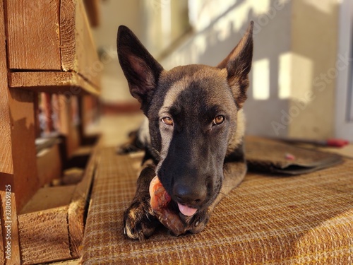 German shepherd dog young puppy eating the bone, meat or granula. Slovakia