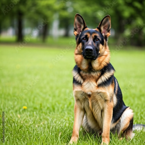 german shepherd dog, sitting, alert, attentive, intelligent, loyal, protective, coat, ear, eye, nose, park, grass, outdoors, green, summer, spring