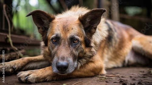 German shepherd peacefully relaxing in a comfortable doghouse nestled in the backyard