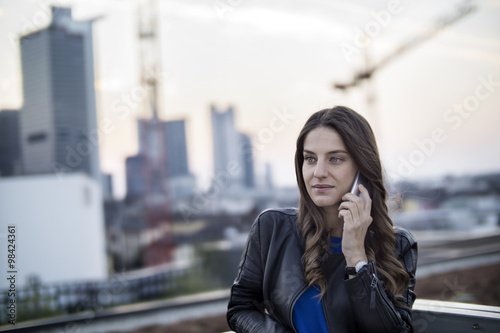 frankfurter, portrait, smartphone, connection, twilight, skyscraper, outdoors, day, hearing, leisure, wireless, jacket