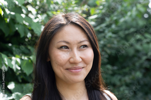 young adult, asian, smiling, brown hair, long hair, portrait, gem, cheerful, content, relaxation, bush, diversity, closeup, looking away, head shot, freiburg, german, outdoors, day, horizontal, one person