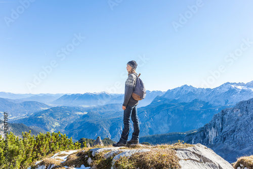 Germany, Garmisch-Partenkirchen, Alpspitze, Osterfelderkopf, female hiker on viewpoint looking at view