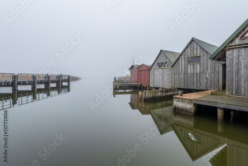 Germany, Mecklenburg-Western Pomerania, Zingst, Pier and row of coastal boathouses