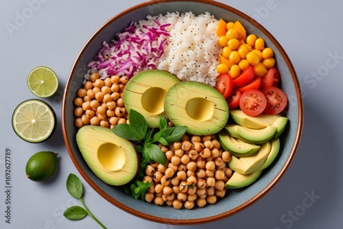 Gesunde Buddha-Bowl mit Avocado, Kichererbsen, Reis, Linsen, Tomaten und frischen Kräutern, vegane Mahlzeit, bunte Schüssel, ausgewogene Ernährung, vegetarisches Gericht