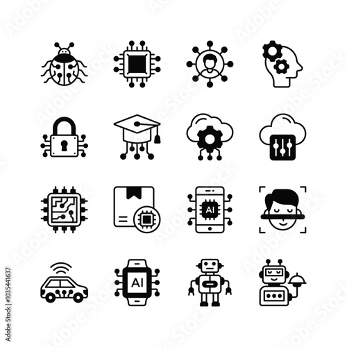 life, insect, bug, processor, microprocessor, microchip, chips, use, network, padlock, lock, security, protection, graduation, cognition, setting, maintenance, cloud, storage, hardware, delivery, package, parcel, mobile, smartphone, face, scanning, smart, car, robot, robotic, waiter, service, artificial, intelligence, ai, technology, future, futuristic, machine, learning, deep, intelligent, system, set, icon, vector